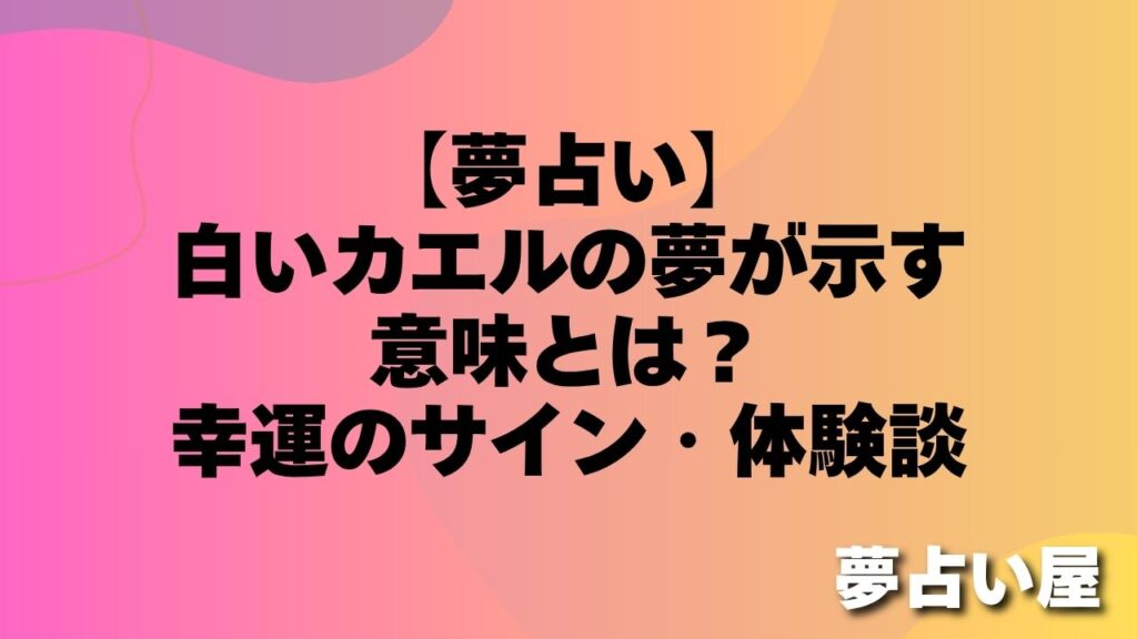 「真っ白なカエルが夢に出てきました。とてもきれいで神秘的な感じがして、良い夢だったと思います。」(30代・女性) 「白いカエルが手の上に乗ってくる夢を見ました。縁起が良いのか気になっています。」(40代・男性) 白いカエルの夢は、その神秘的な... -