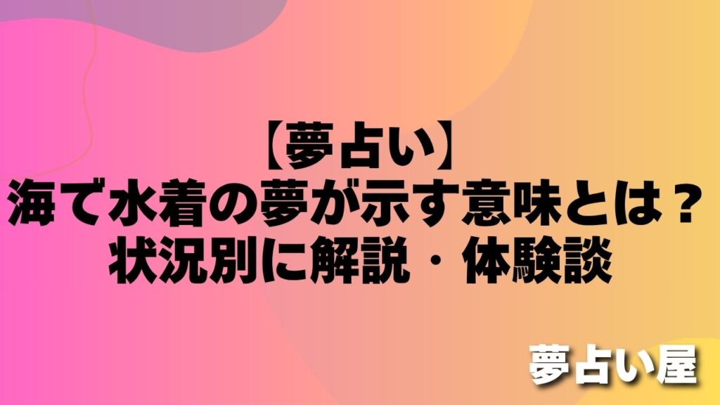 海で水着を着ている夢を見た。なんか恥ずかしいような、開放的な気持ちだったけどこれって何を意味するの? 水着で海を泳ぐ夢を見たんだけど、すごく楽しい夢だった!夢占いではどんな意味があるのかな。 夢占い屋 店主 夢占い屋 店主 海で水着の夢は、自... -