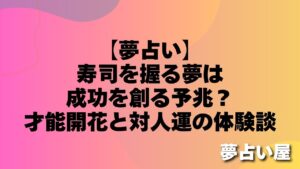 【夢占い】寿司を握る夢は成功を創る予兆?才能開花と対人運の体験談 「夢の中で、職人さんのように見事なお寿司を握っていて気分が良かった!」「お寿司を握ろうとするけれど、シャリが崩れてしまって焦る夢を見た…」 お寿司を握るという...
